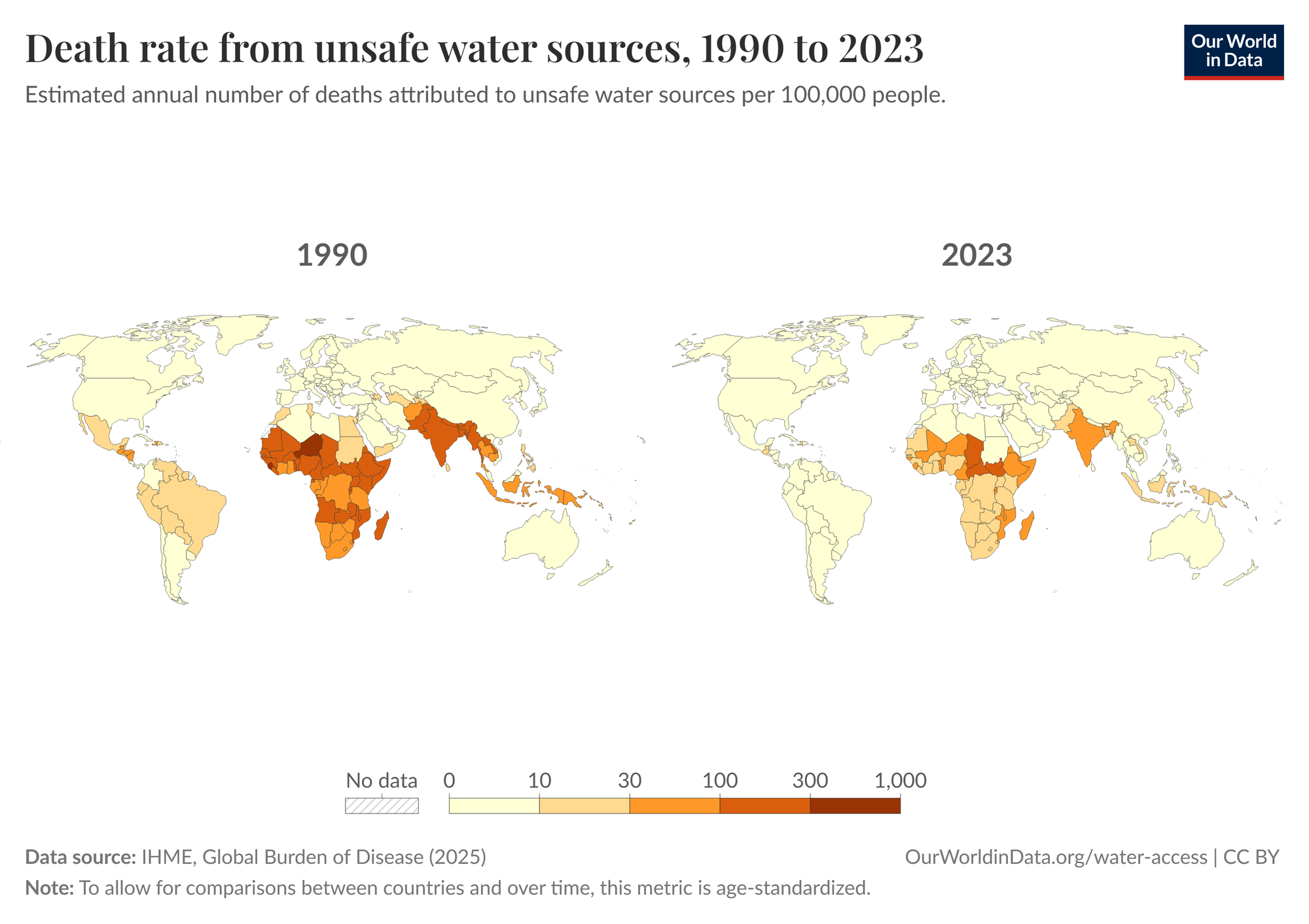 Africa, the Middle East and India are areas that are suffering the most from a lack of safe drinking water, but it has been improving over time.