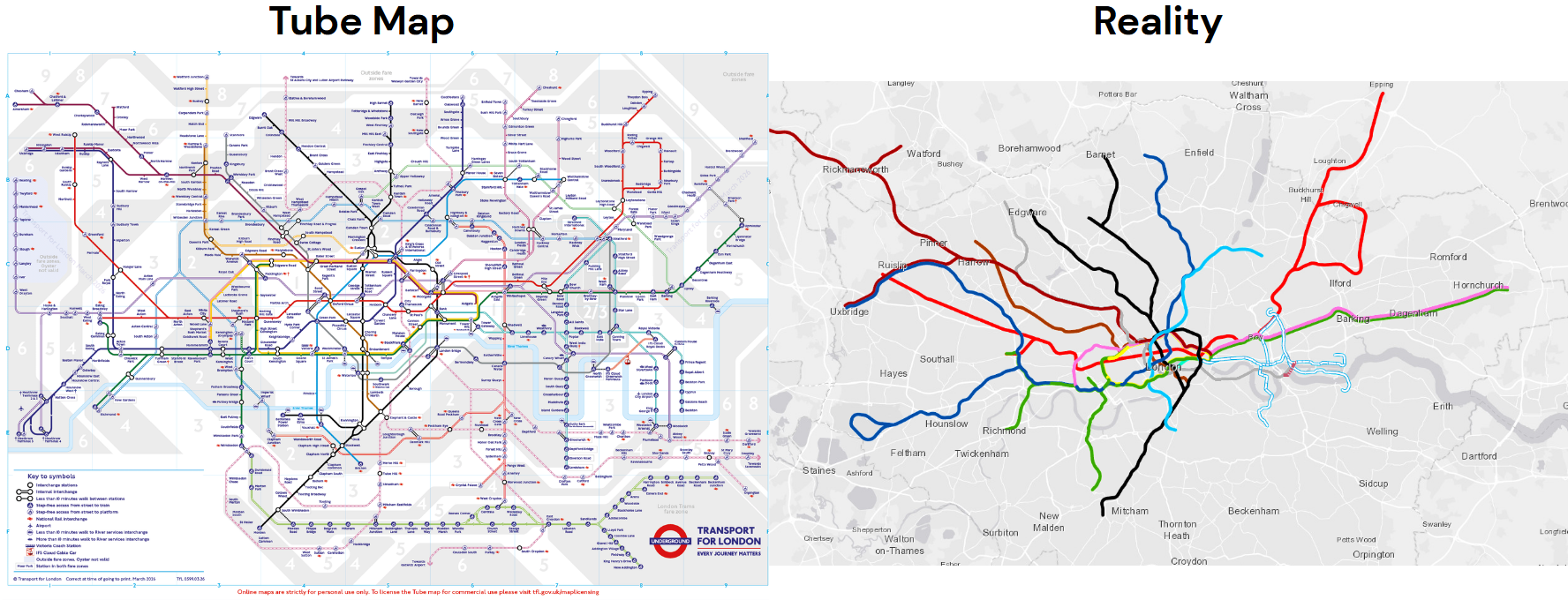 Every day, millions of people look at the tube map, and what they see is an abstraction of reality. The tube isn't a nice set of straight lines underneath London. Instead, they are curved all across the city. Even the distances are a lie!