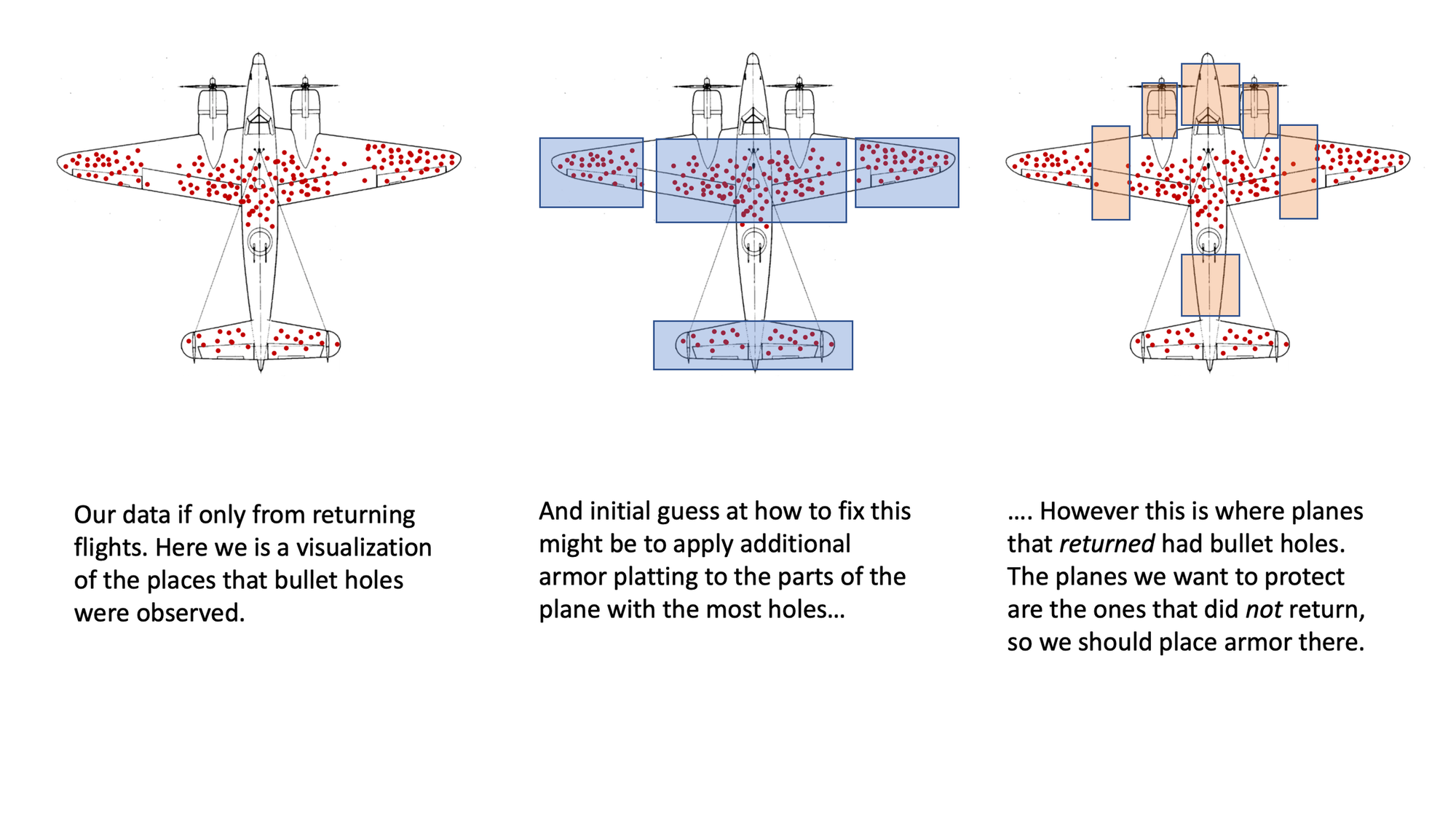 At first, when looking at the planes that have returned from combat, you might think to look at where these planes have been shot and decide to protect them even more.
