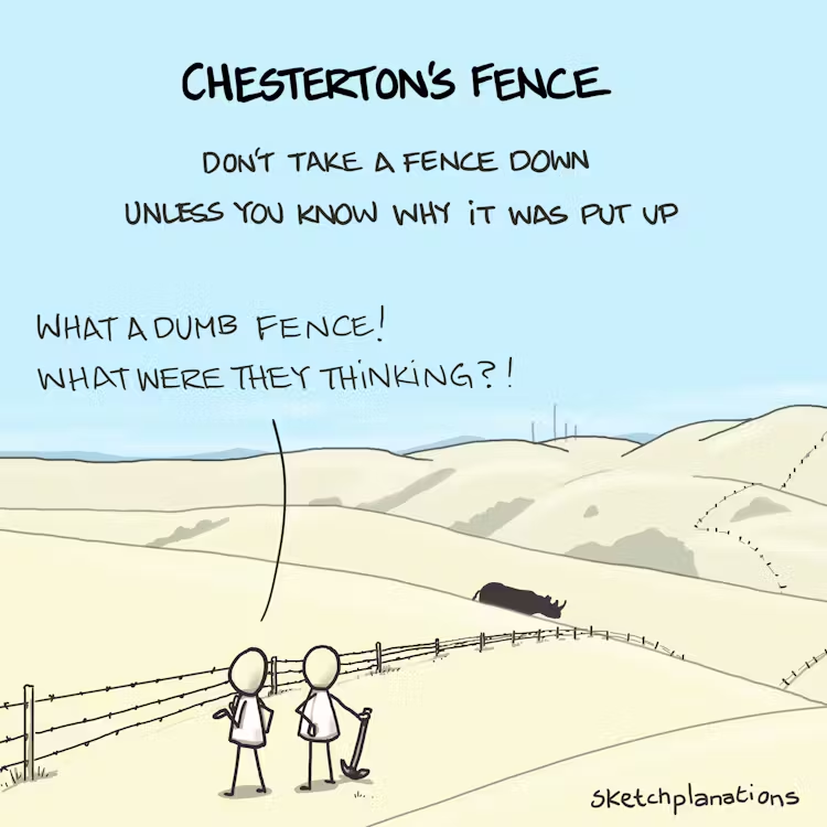 Chesterton’s Fence explains that just because you don’t know the reason for something does not mean it’s smart to remove it.