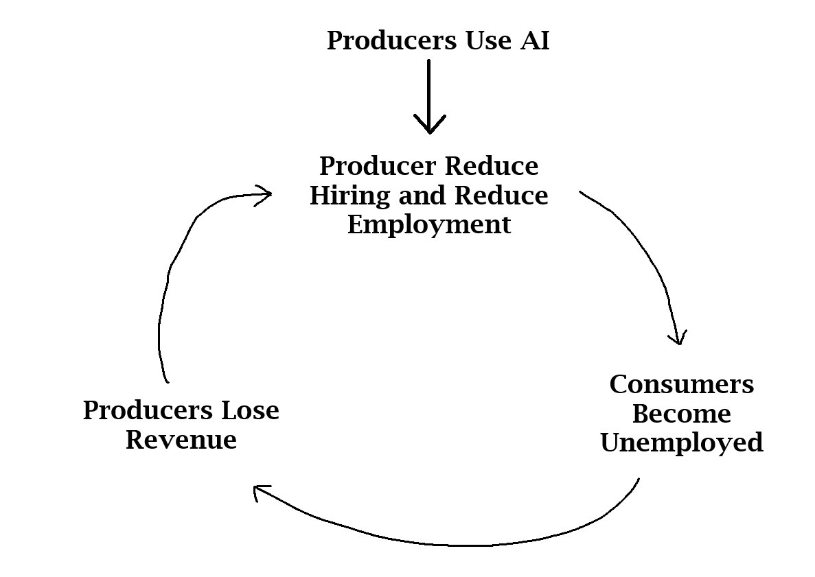 Companies start using AI to replace jobs, people then become unemployed, because of the lack of salary they have, they stop consuming as much, and eventually producers receive lower revenue.